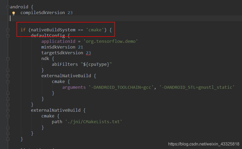 再滚动到defaultConfig中,发现问题就出现在这个if判断语句中,明显的看出,只有nativeBuildSystem为‘cmake’时,才执行defaultConfig语句块。